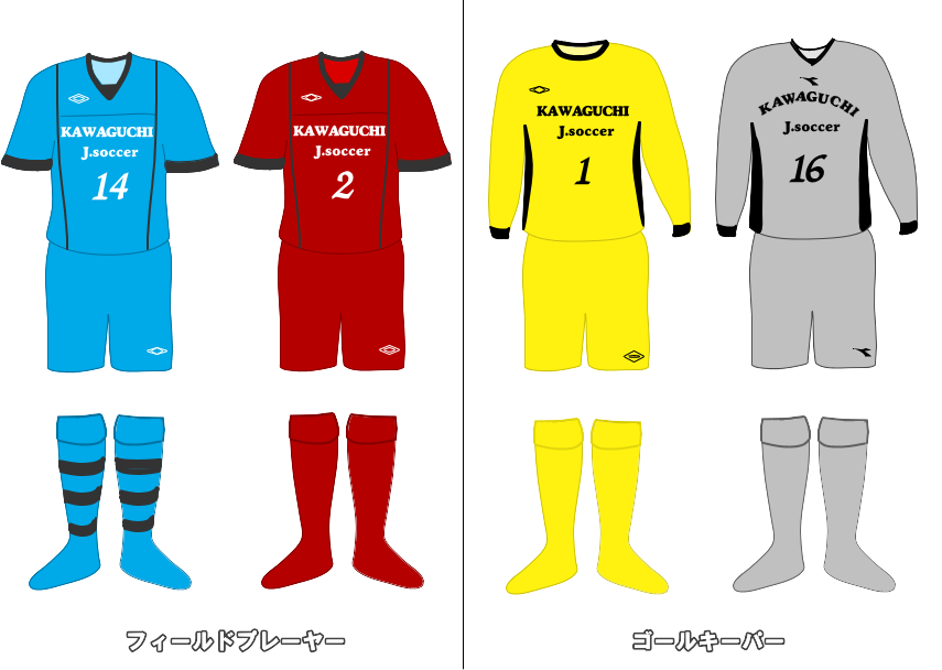 フィールドプレーヤーとゴールキーパー、それぞれ2色ずつ用意していて 相手チームとの違いが判りやすい色を着て試合をするヨ。
