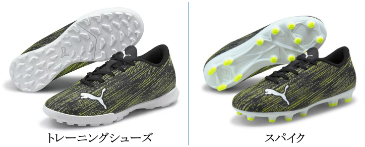 トレーニングシューズはスタッドが小さくて多くスパイクに比べて柔らかい素材(ゴム等)を使用しているのが特徴。スパイクより滑り止めとしての効果は小さいけど、足への負担が小さいヨ。