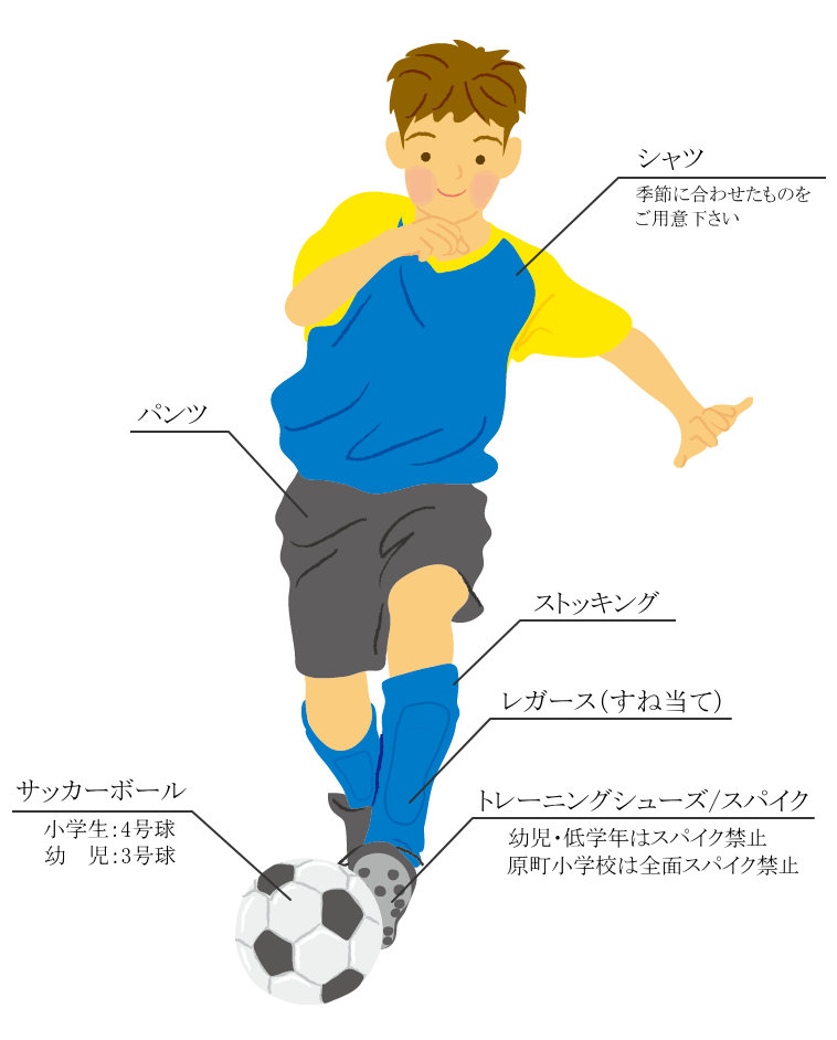 高学年(4年~6年)はサッカー用のトレーニングシューズと場合によってはスパイクをご用意ください。(紐靴は自分で結べるように自宅で練習をしてきて下さい)